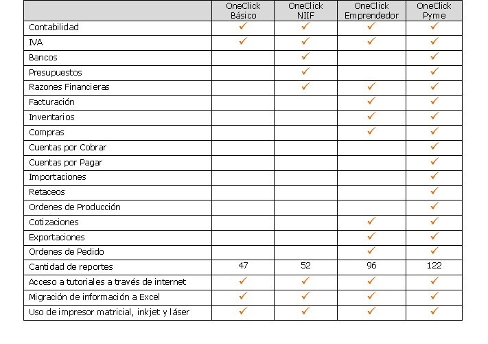 OneClick es una solución integrada fundamental para el crecimiento de la mipyme, ya que disminuye los costos, aumenta la innovación empresarial y mejora los tiempos de proceso operativo. Para lograr esto, OneClick integra una serie de módulos que inicia con la facturación y finaliza con la contabilización de operaciones diarias de una manera fácil e intuitiva, eliminando de esta manera la repetición de tareas y